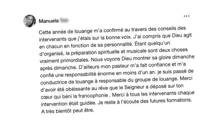Depuis septembre 2022, j’ai également lancé une école de louange en ligne la “Louange Académie” qui accompagne tous ceux qui souhaitent se former pour développer leur plein potentiel et servir Dieu plus efficacement dans leur ministère de louange.